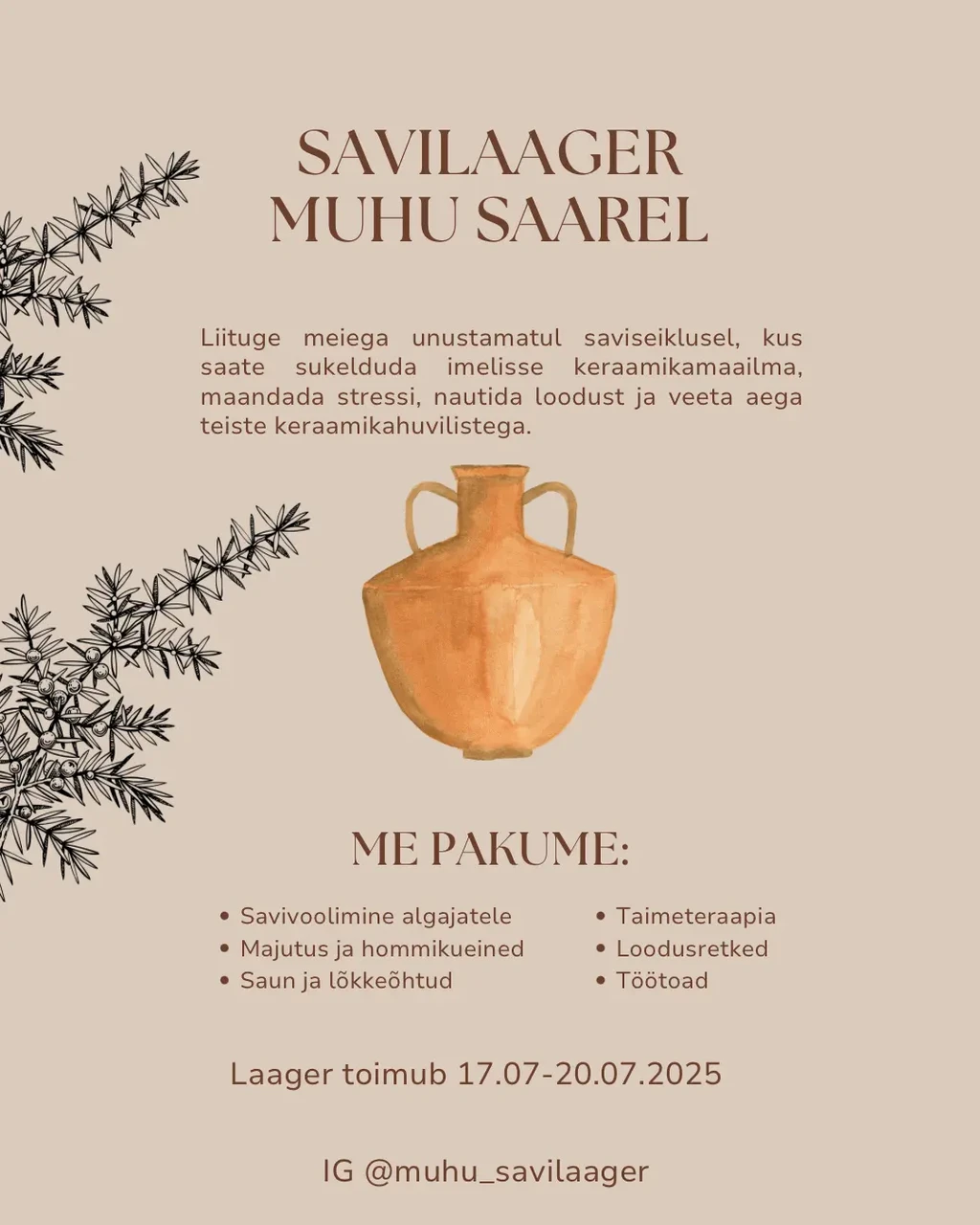 Laagris pakume majutust ja hommikusööke, sauna ja lõkkeõhtuid. Savivoolimist läbi erinevate tehnikate, lisades juurde looduslähedast teraapiat. Külastame kohalike savimeistreid, viime läbi töötubasid, käime looduses ja naudime igat hetke!